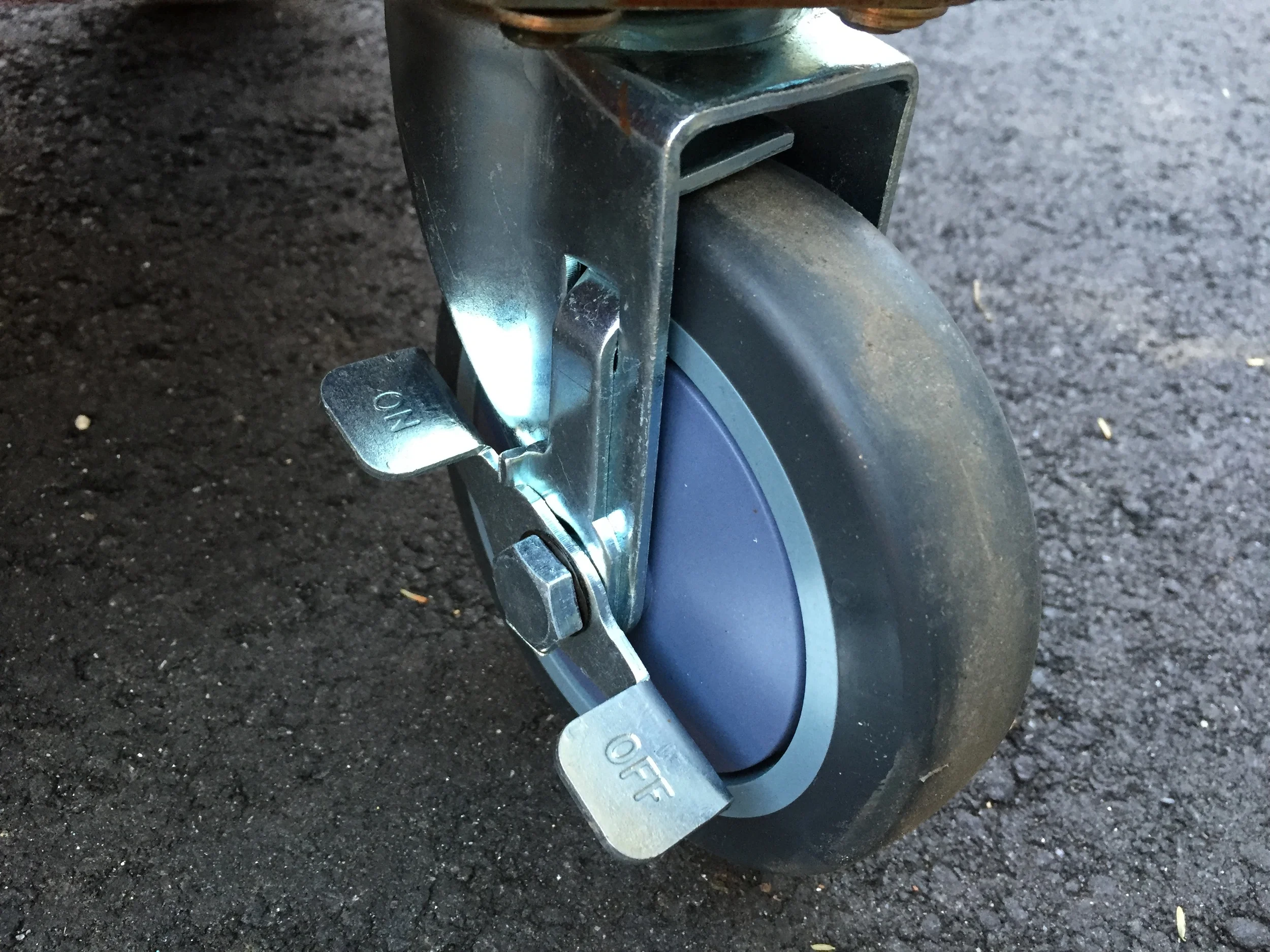 After cutting and drilling the pieces together, I installed the wheels, one having a brake option to keep the rack from rolling away. Depending on how level your surface is, you may want all of your wheels to feature a brake.
